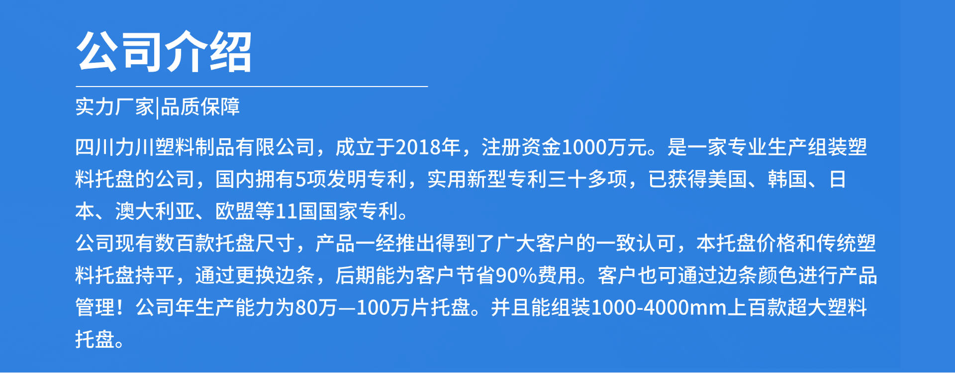 四川力川塑料制品有限公司成立于2018年,注冊(cè)資金1000萬(wàn)元。是一家專(zhuān)業(yè)生產(chǎn)組裝塑料托盤(pán)公司,擁有多項(xiàng)國(guó)家專(zhuān)利,發(fā)明專(zhuān)利兩項(xiàng),實(shí)用新型專(zhuān)利八項(xiàng),已成功取得PCT國(guó)際專(zhuān)利!(含130個(gè)國(guó)家!仿冒必究!),并正在申請(qǐng)美國(guó)、韓國(guó)、歐盟、日本、澳大利亞等國(guó)家的專(zhuān)利!公司產(chǎn)品一經(jīng)推出得到了廣大客戶(hù)的一致認(rèn)可,后期還能為客戶(hù)節(jié)省90%費(fèi)用!力川公司自有大尺寸3D打印機(jī),專(zhuān)業(yè)的質(zhì)檢部門(mén)!采取全球授權(quán)委托加工生產(chǎn)模式,自有專(zhuān)利,自有研發(fā)設(shè)計(jì)團(tuán)隊(duì),自有模具,自主進(jìn)料,自主裝配,自主銷(xiāo)售的輕資產(chǎn)模式,目前每年能生產(chǎn)80-100萬(wàn)片組裝塑料托盤(pán)!